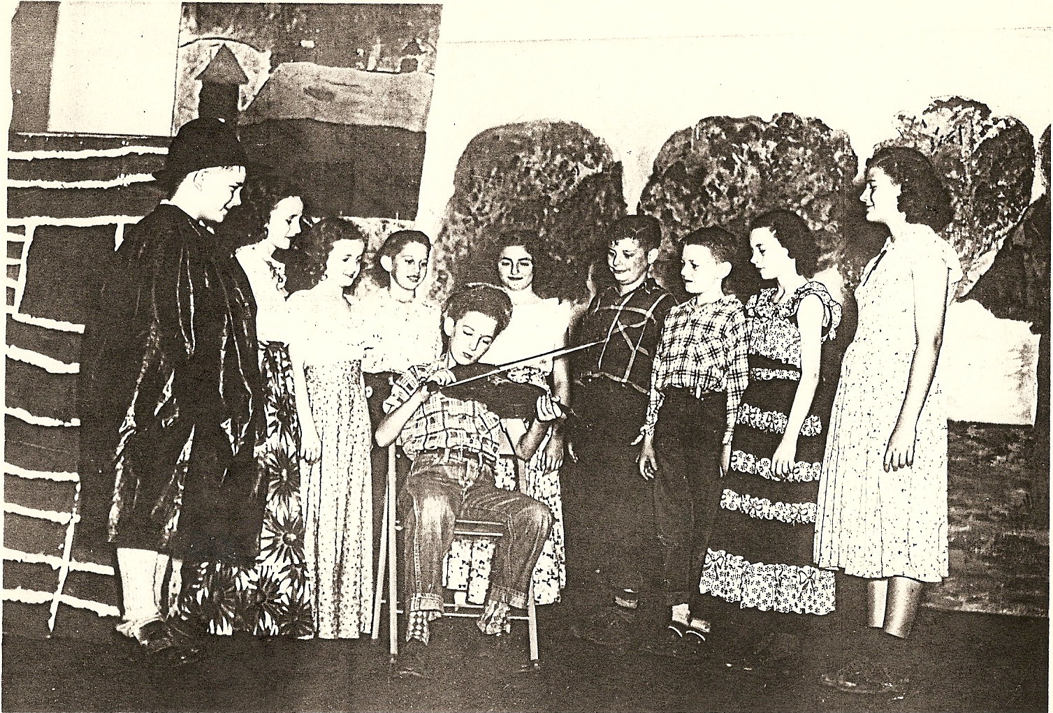 Robert Cole, Ann Glover Teeter, Ilah Mae Cypert Herndon, Aubrey Knight, Royce Gary (the Arkansas Traveler), Sandra Loket, Jim Wallace, George Grisham, Mary Ann Bates Greenwood, and an unidentified. 1949 or 1950